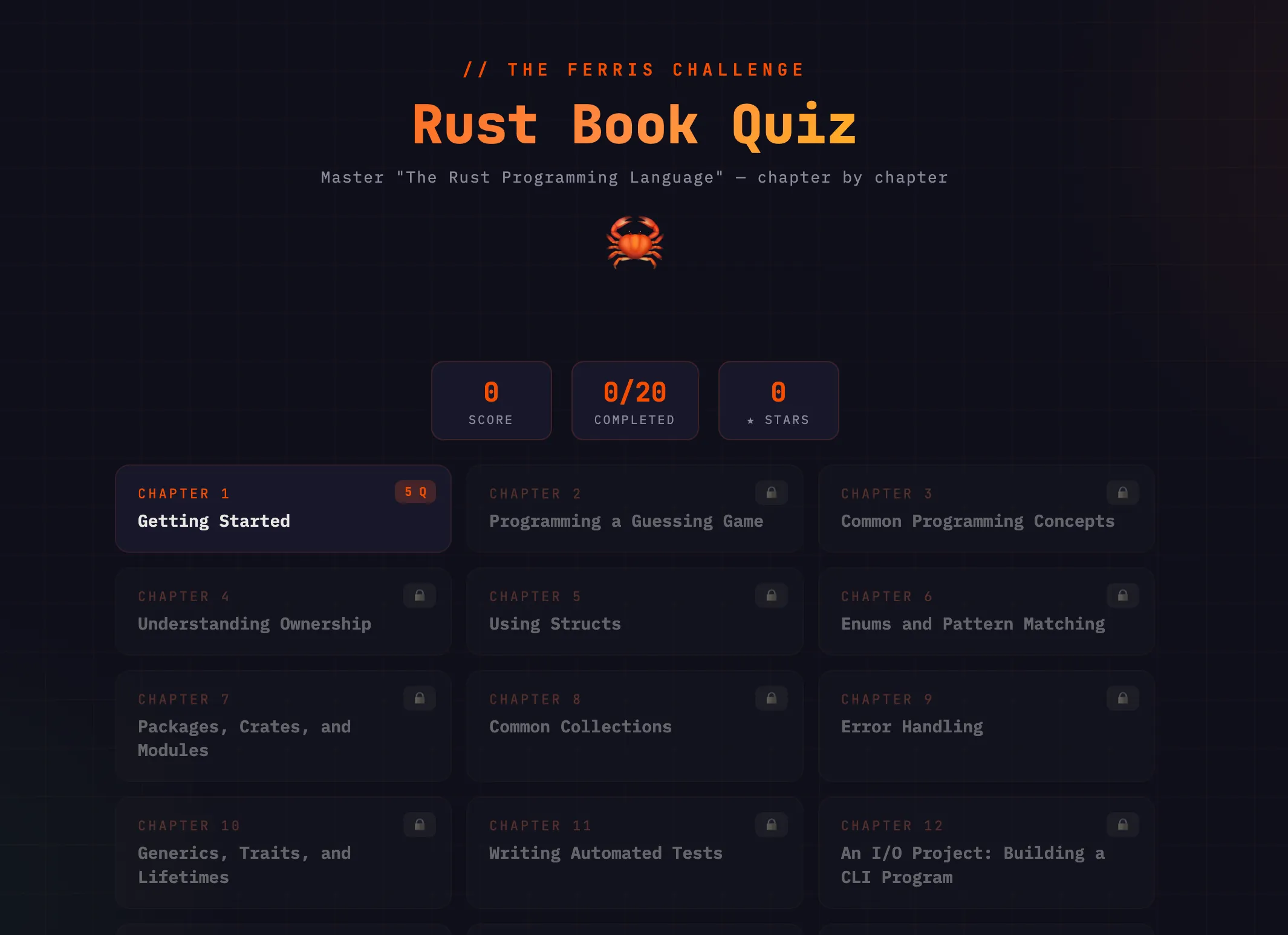 An interactive browser-based quiz app that turns chapters from the official Rust book into gamified 5-question levels with progressive unlocking and star ratings.